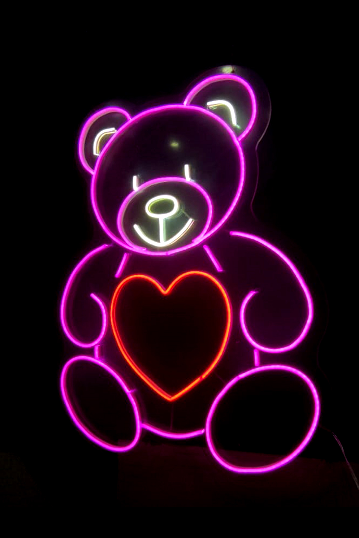 Dekoratif Neon Led Kalpli Ayıcık Şeklinde, Şeffaf Pleksi Üzerine, Neon Tablo.