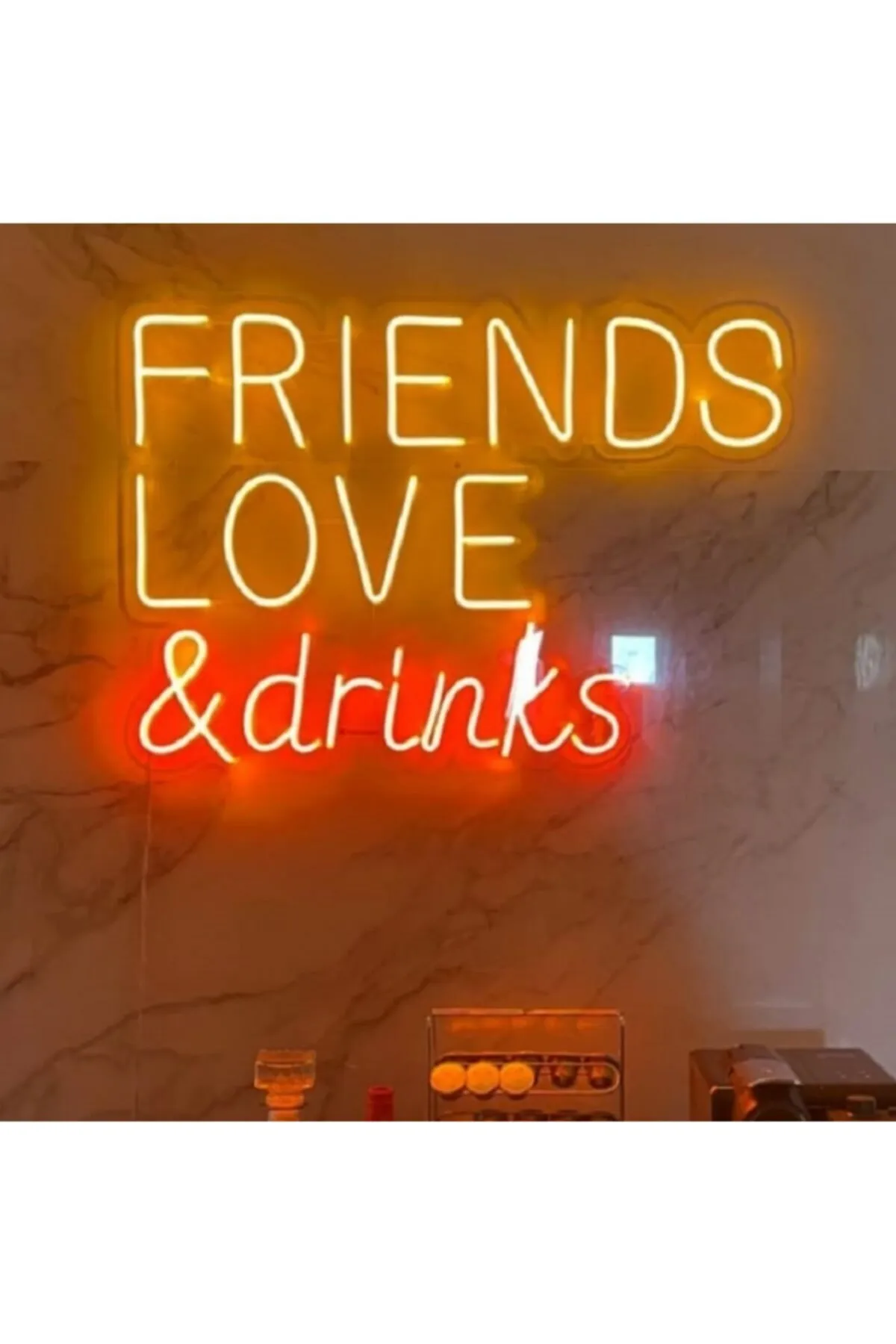 Neon Led Işıklı Friends Love & Drinks Yazılı Şeffaf Pleksi Üzerine Neon Led Tabela,