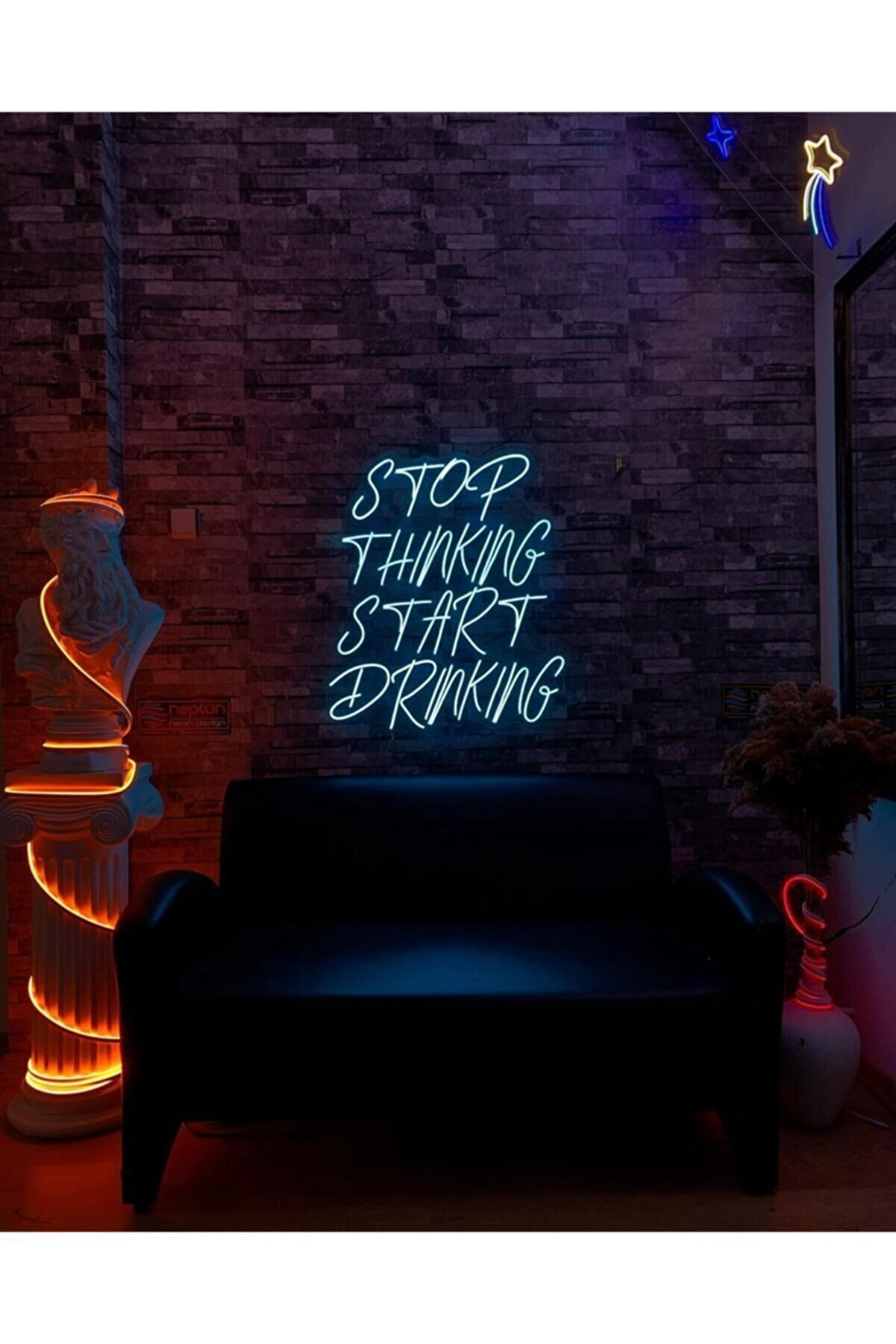 Neon Led Işıklı Stop Thinking Start Drinking Yazılı Şeffaf Pleksi Üzerine Neon Led Tabela,