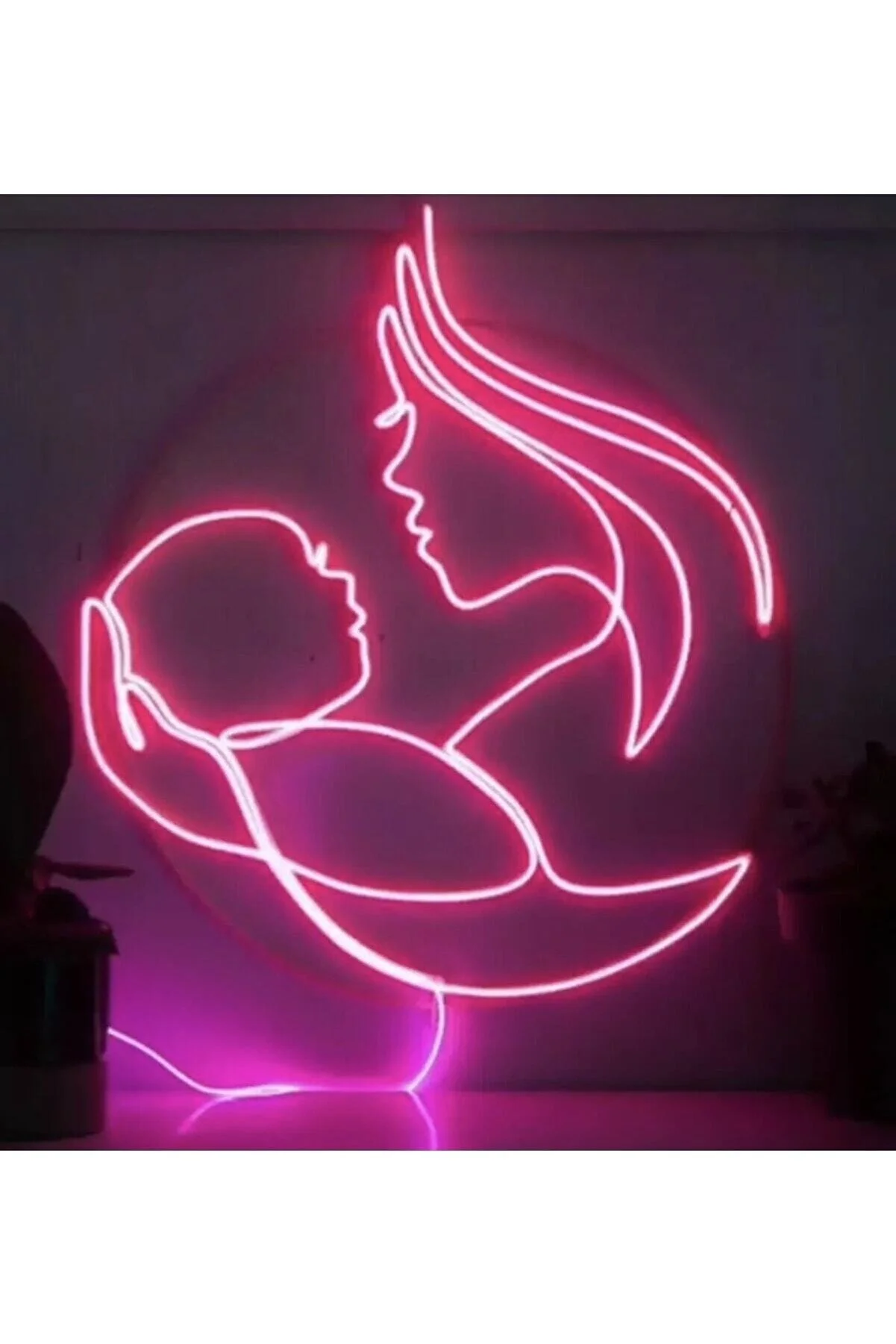 Neon Led Işıklı Anne ve Bebek Şeklinde Şeffaf Pleksi Üzerine Neon Led Tabela,