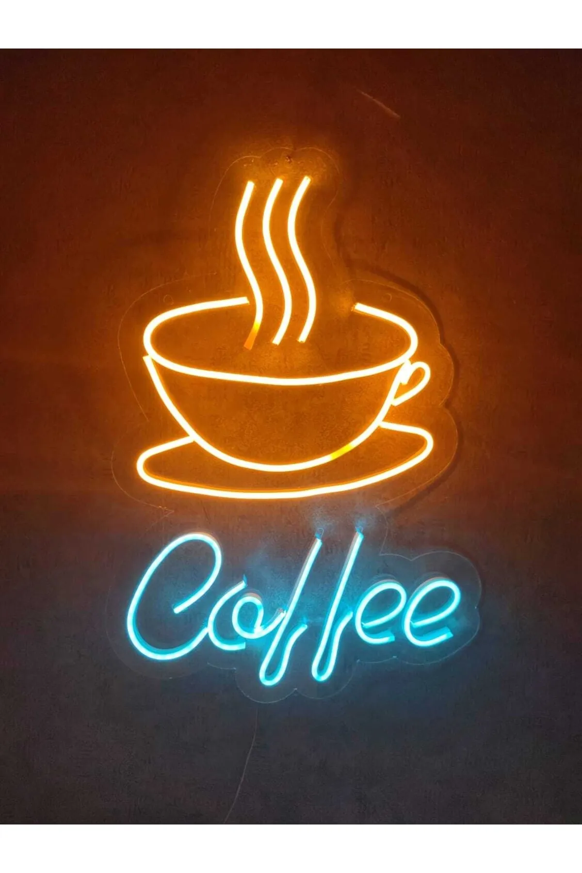 Neon Led Işıklı Coffee Yazısı ve Kahve Fincanı Şeklinde Şeffaf Pleksi Üzerine Neon Led Tabela,