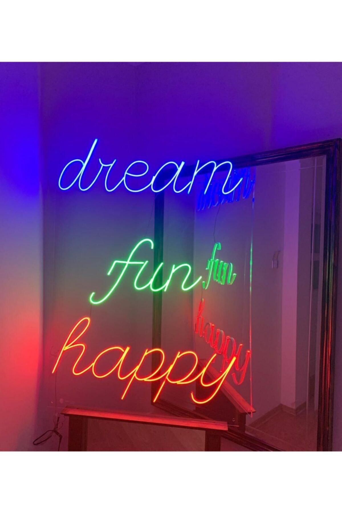 Neon Led Işıklı Dream Fun Happy Yazılı Dikdörtgen Şeklinde Şeffaf Pleksi Üzerine Neon Led Tabela,