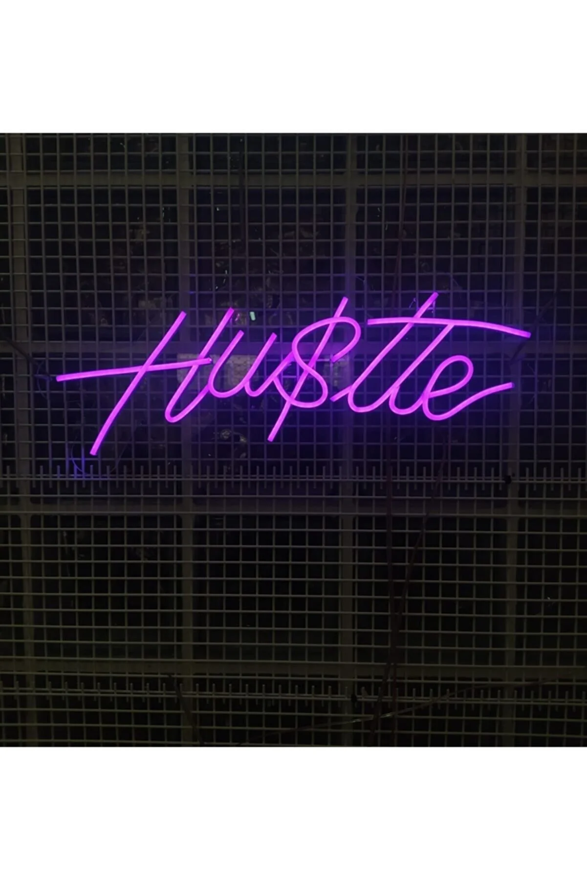 Neon Led Işıklı Hustle Yazılı Şeffaf Pleksi Üzerine Neon Led Tabela,