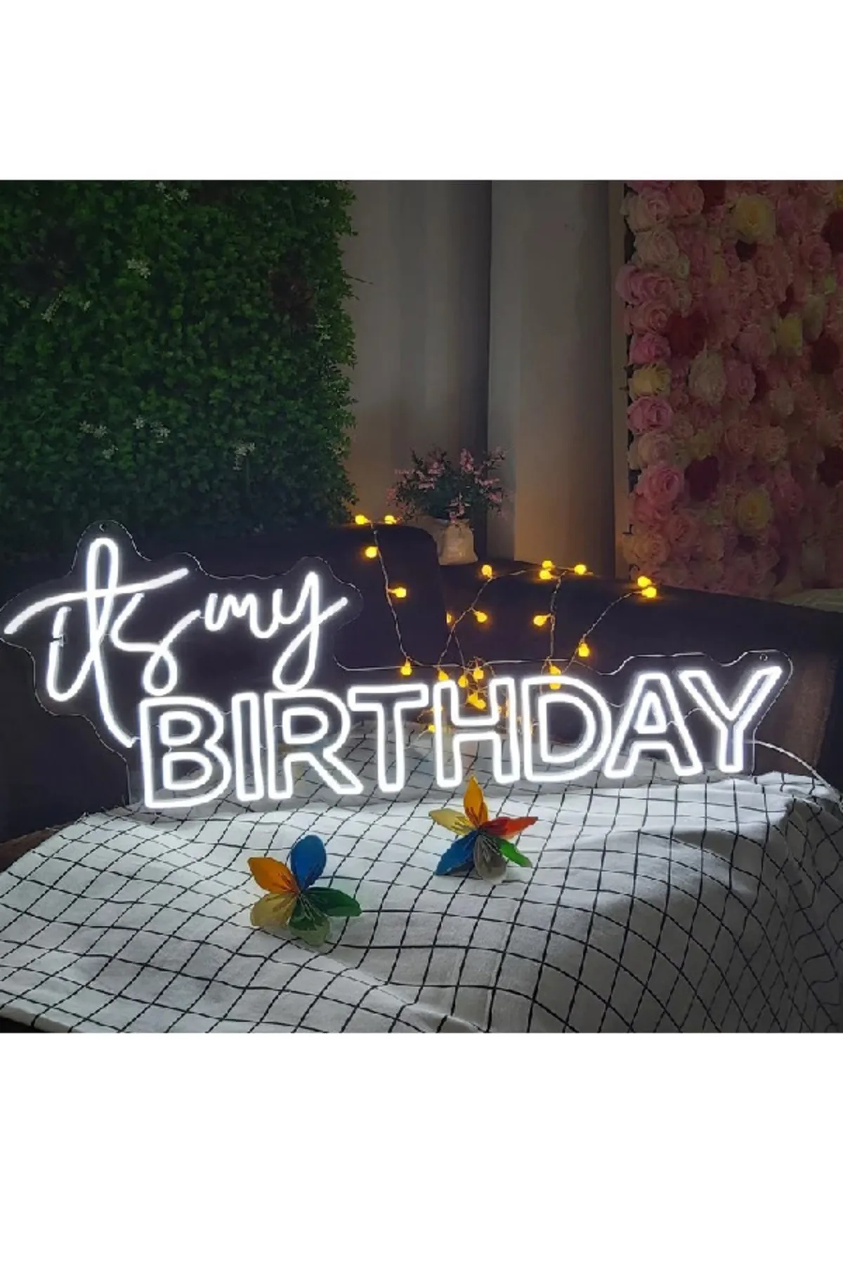Neon Led Işıklı It's My Birthday Yazılı Şeffaf Pleksi Üzerine Neon Led Tabela,