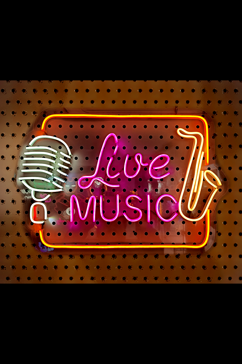 Neon Led Işıklı Live Music Yazılı Mikrofon ve Saksafon Şeklinde Şeffaf Pleksi Üzerine Neon Led Tabela,