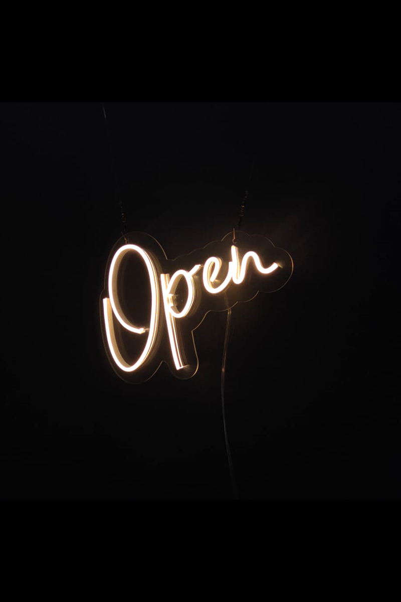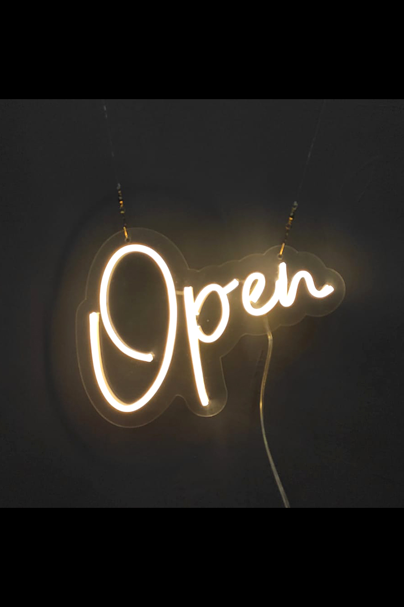 Neon Led Işıklı Open Yazılı Şeffaf Pleksi Üzerine Neon Led Tabela,